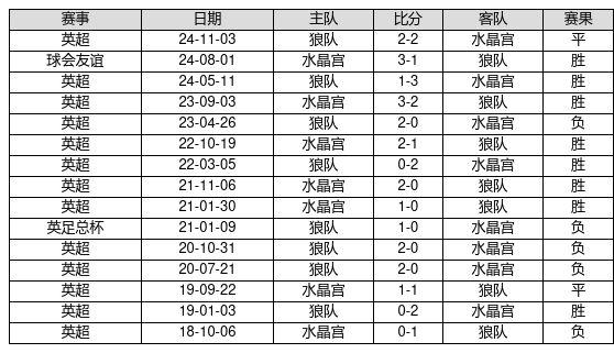 水晶宫 VS 狼队两队近10年的交战次数为15场,水晶宫8胜2平5负,赢球概率为53.3%,平局概率为13.3%,输球概率为33.3%。