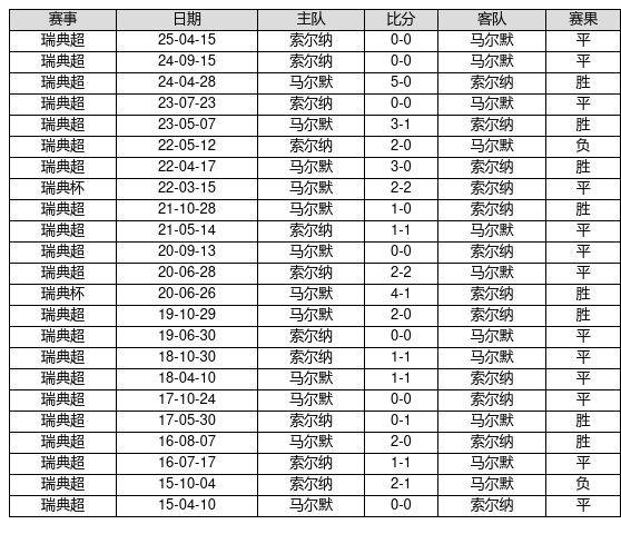 马尔默 VS 索尔纳两队近10年的交战次数为23场,马尔默8胜13平2负,赢球概率为34.8%,平局概率为56.5%,输球概率为8.7%。