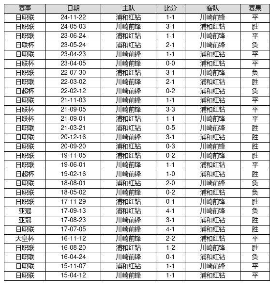 川崎前锋 VS 浦和红钻两队近10年的交战次数为29场,川崎前锋11胜11平7负,赢球概率为37.9%,平局概率为37.9%,输球概率为24.1%。