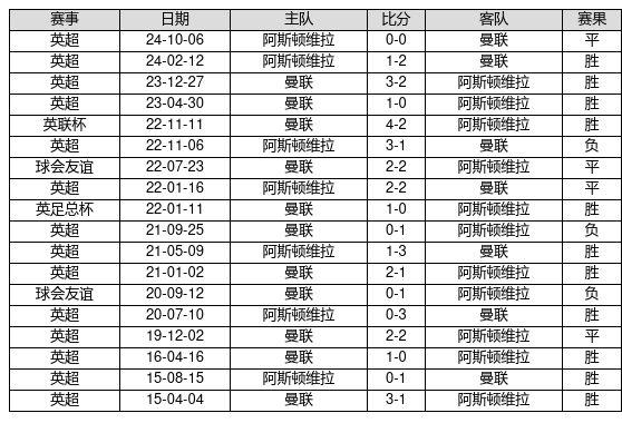 曼联 VS 阿斯顿维拉两队近10年的交战次数为18场,曼联11胜4平3负,赢球概率为61.1%,平局概率为22.2%,输球概率为16.7%。