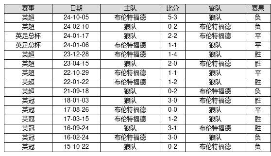 狼队 VS 布伦特福德两队近10年的交战次数为15场,狼队6胜4平5负,赢球概率为40.0%,平局概率为26.7%,输球概率为33.3%。