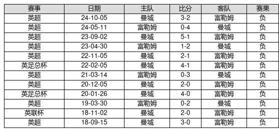 富勒姆 VS 曼城两队近10年的交战次数为12场,富勒姆0胜0平12负,赢球概率为0.0%,平局概率为0.0%,输球概率为100.0%。