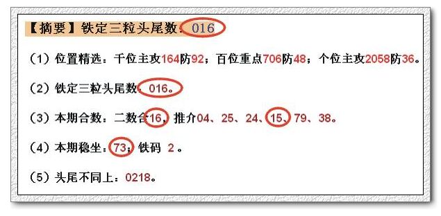 (1)位置精选:千位主攻624防09;百位重点738防45;个位主攻3857防46。