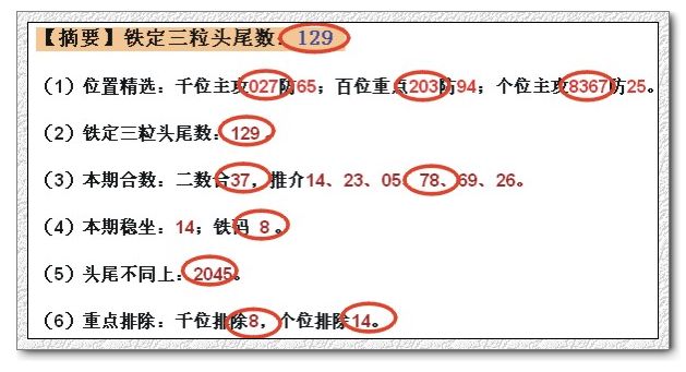 (1)位置精选:千位主攻027防49;百位重点056防38;个位主攻9678防53。