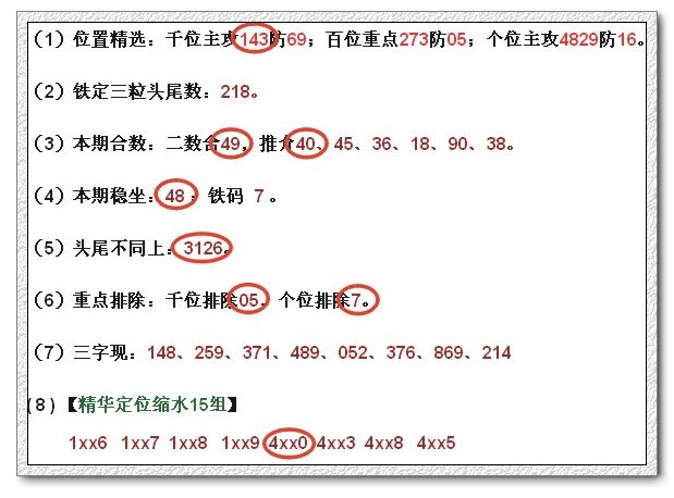 (1)位置精选:千位主攻368防27;百位重点180防59;个位主攻3849防27。