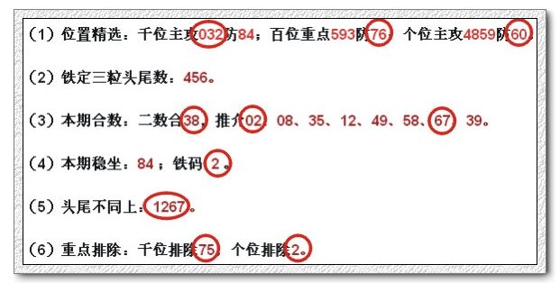 (1)位置精选:千位主攻682防17;百位重点369防05;个位主攻8593防61。