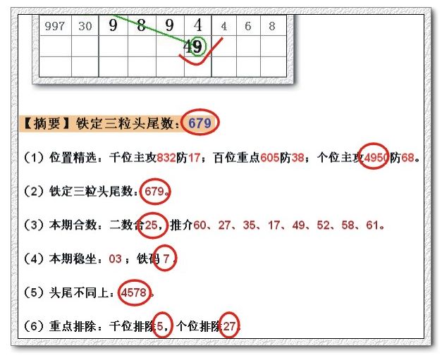 (1)位置精选:千位主攻160防94;百位重点231防85;个位主攻4968防05。