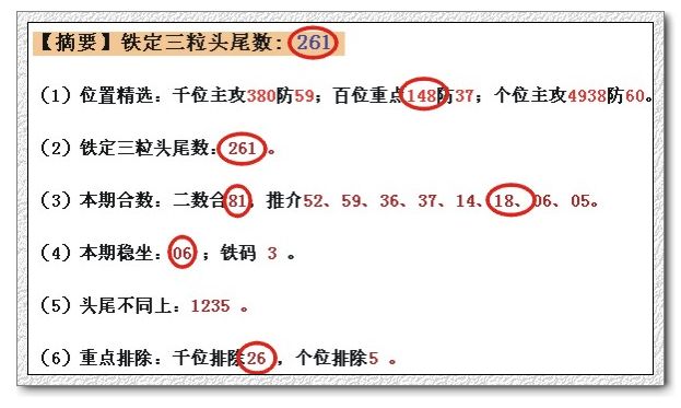 (1)位置精选:千位主攻162防85;百位重点624防59;个位主攻3849防56。