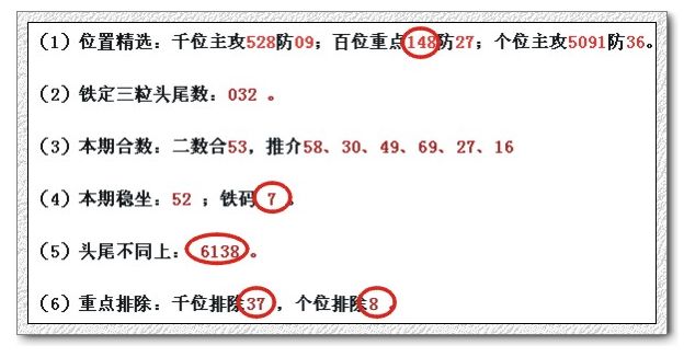 (1)位置精选:千位主攻728防61;百位重点384防09;个位主攻4961防38。