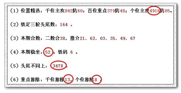 (1)位置精选:千位主攻527防69;百位重点148防06;个位主攻3816防29。