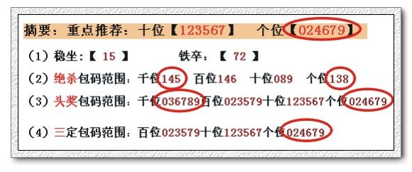 (2)绝杀包码范围:千位079 百位348 十位148 个位068