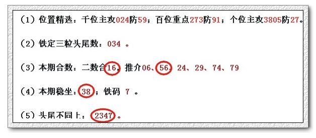 (1)位置精选:千位主攻021防63;百位重点493防06;个位主攻0582防49。