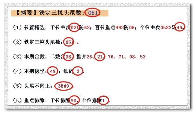 (1)位置精选:千位主攻056防29;百位重点162防38;个位主攻3489防26。