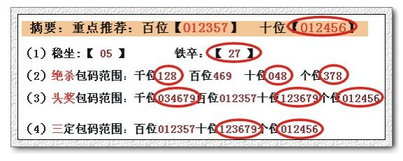 (2)绝杀包码范围:千位017 百位058 十位238 个位025