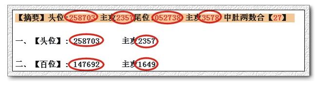 【摘要】头位:258703 主攻0538尾位:052738 主攻0258 中肚两数合【49】