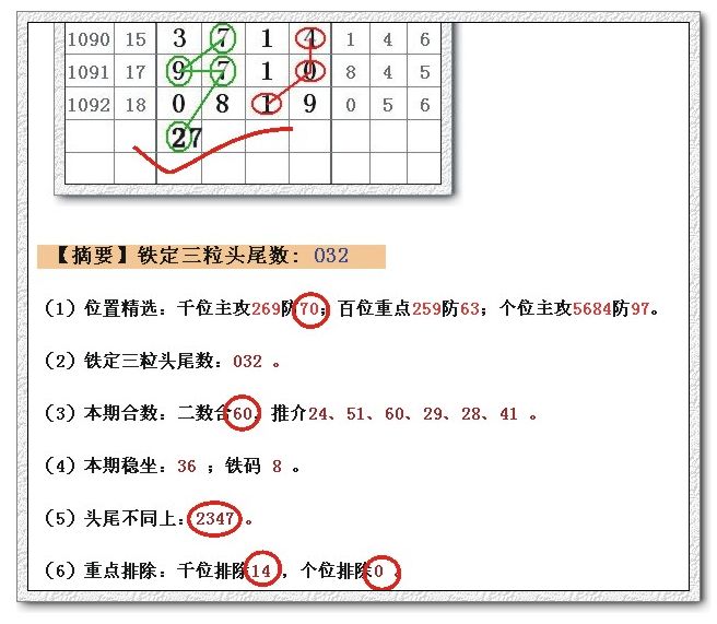 (1)位置精选:千位主攻052防63;百位重点748防90;个位主攻6289防47。