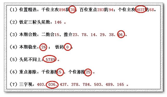 (1)位置精选:千位主攻035防74 ;百位重点298防63;个位主攻5689防73。
