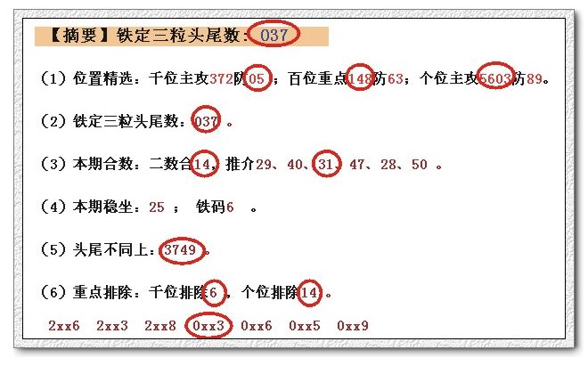 (1)位置精选:千位主攻236防75 ;百位重点078防69;个位主攻1486防72。