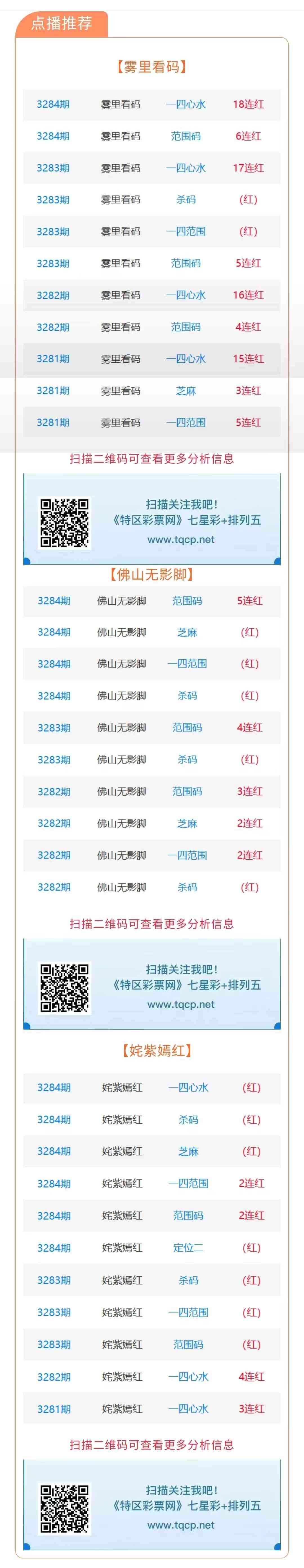 七星彩3285期点播推荐雾里看码、佛山无影脚和姹紫嫣红 3位分析师