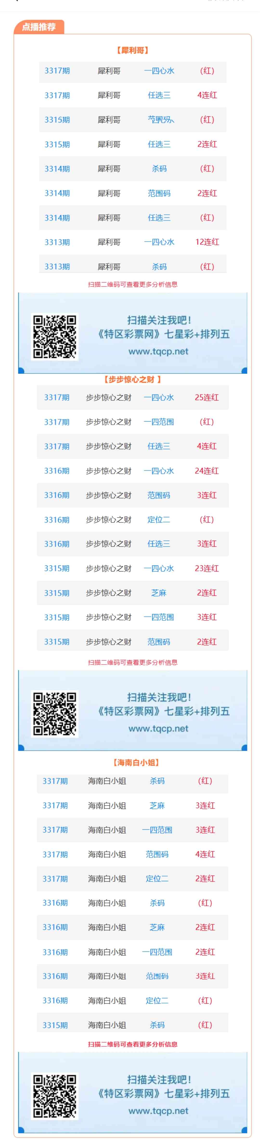 七星彩3318期点播推荐犀利哥、步步惊心之财和海南白小姐 3位分析师