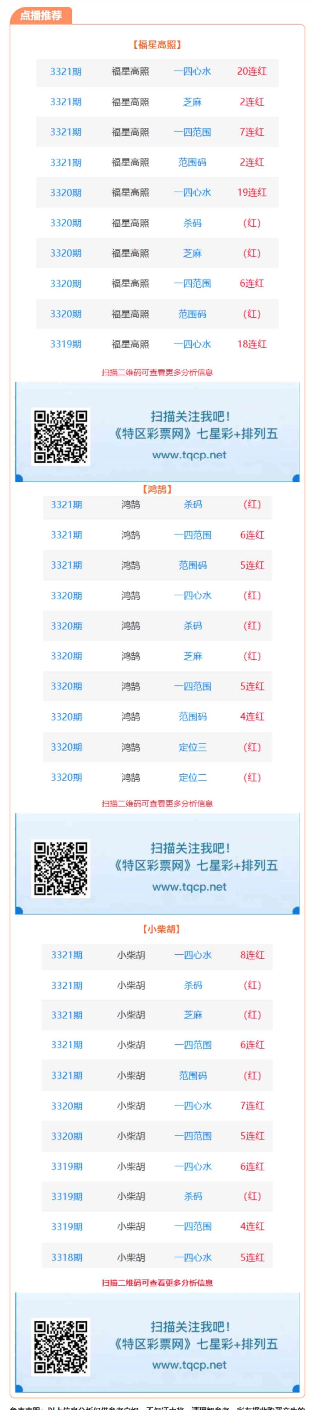 七星彩3322期点播推荐福星高照、鸿鹄和小柴胡 3位分析师