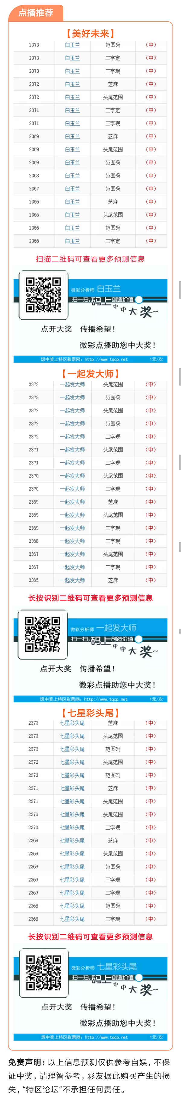 【点播推荐】2374期推荐“美好未来”、“一起发大师”、“七星彩头尾”三位大师