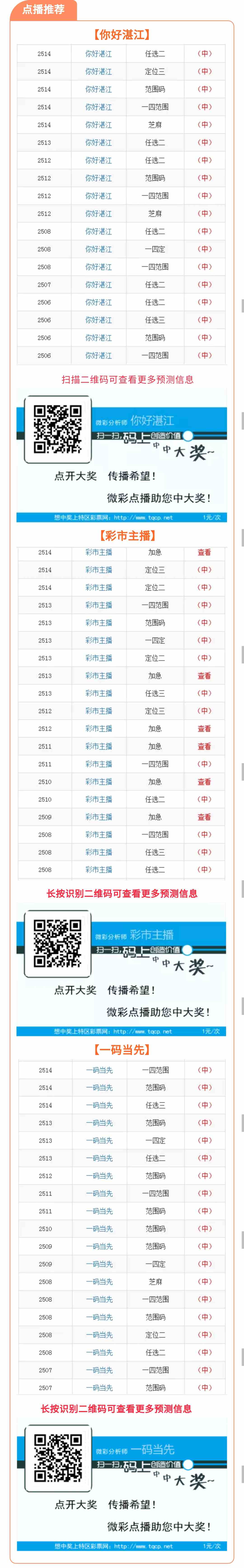 【点播推荐】2515期推荐“你好湛江”“彩市主播““一码当先”3位分析师