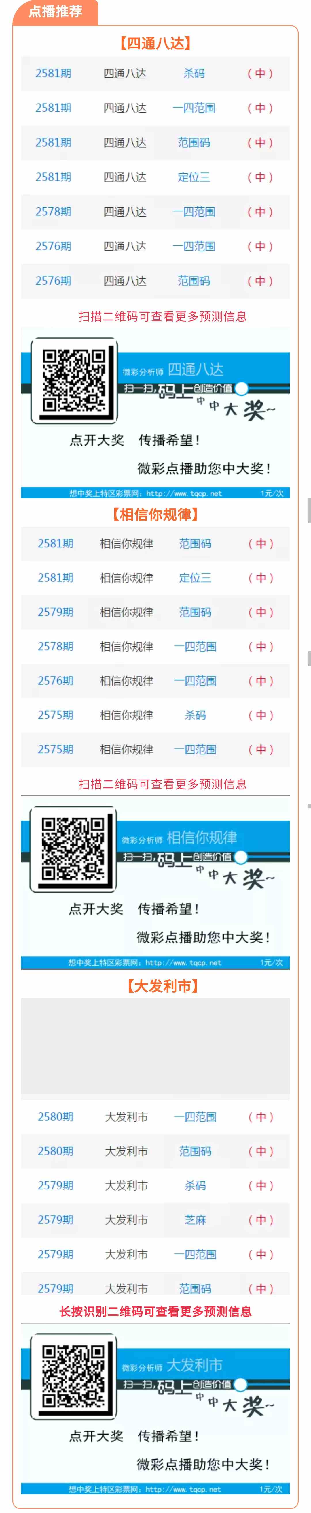 【点播推荐】2582期推荐“四通八达”“相信你规律”“大发利市”3位分析师