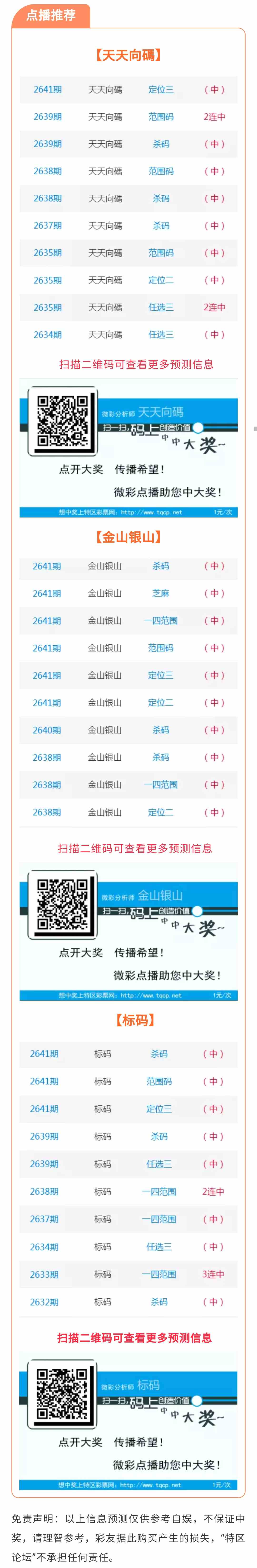 【点播推荐】2642期推荐“天天向碼”“金山银山”“标码”3位分析师