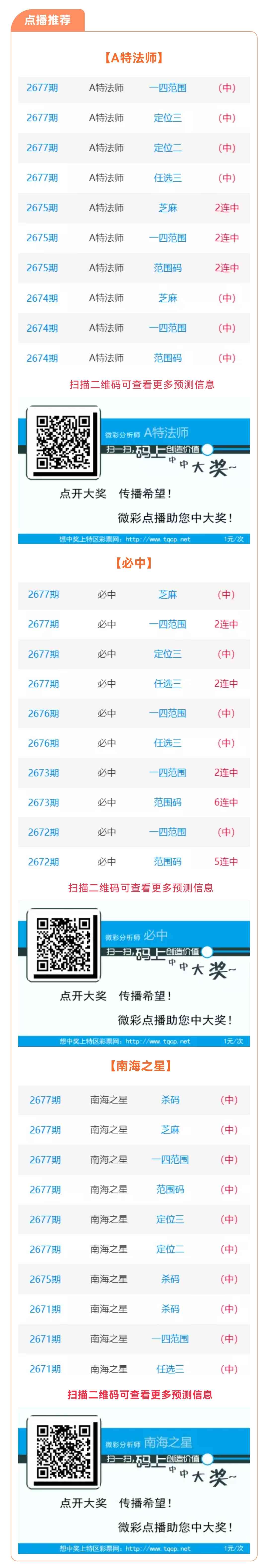 【点播推荐】2678期推荐“A特法师”“必中”“南海之星”3位分析师