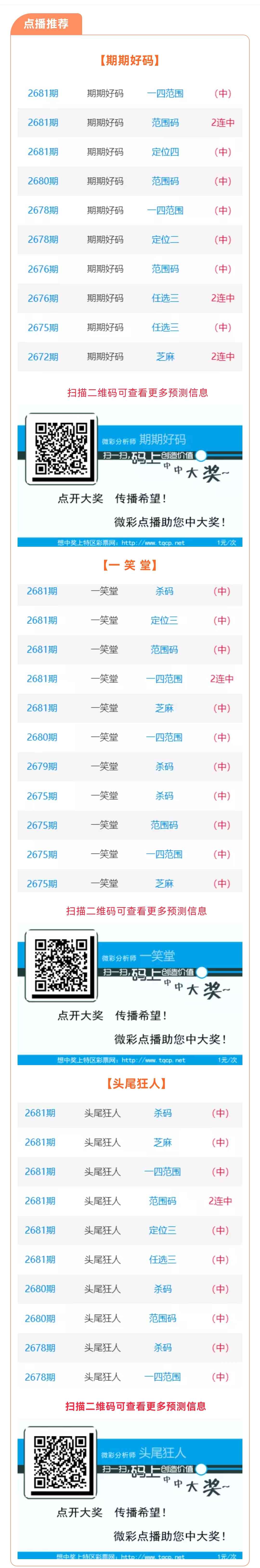 【点播推荐】2682期推荐“期期好码”“一笑堂”“头尾狂人”3位分析师