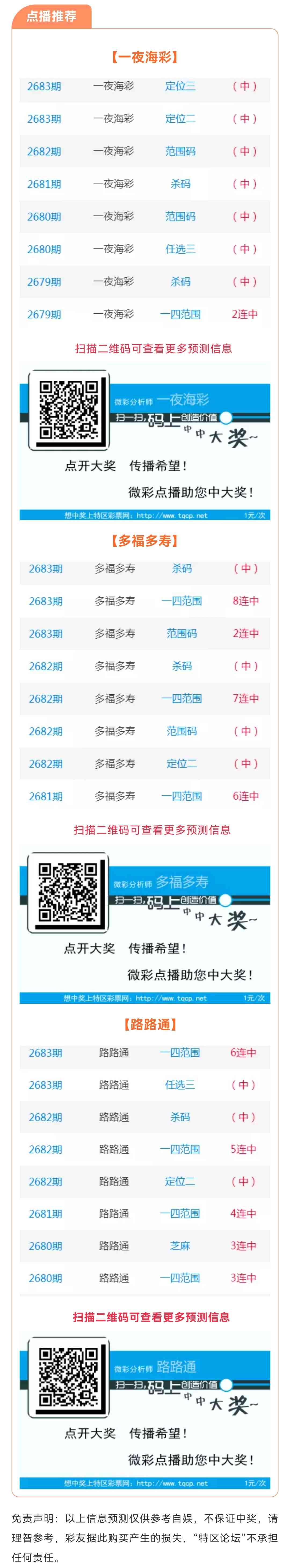 【点播推荐】2684期推荐“一夜海彩”“多福多寿”“路路通”3位分析师