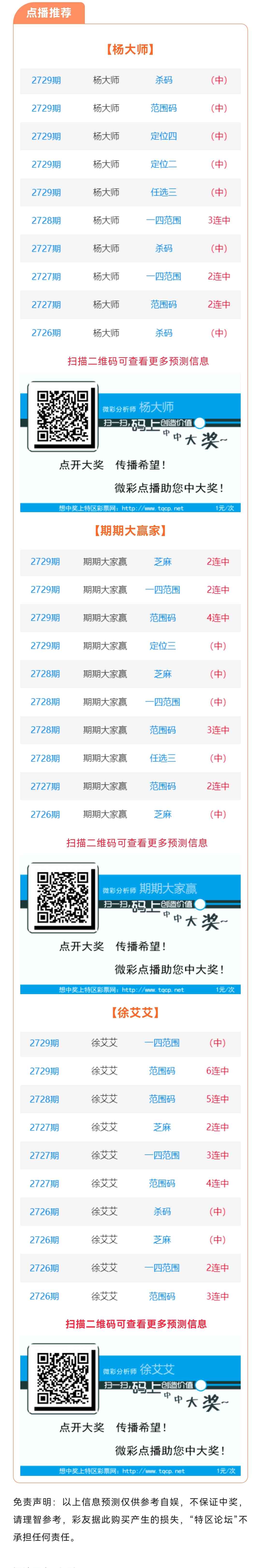 【点播推荐】2730期推荐“杨大师”“期期大家赢”“徐艾艾”3位分析师
