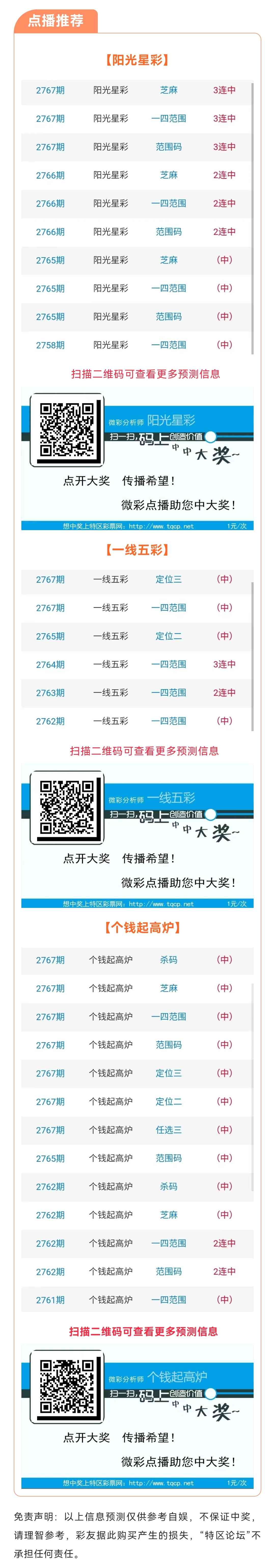 【点播推荐】2768期推荐“阳光星彩”“一线五彩”“个钱起高炉”3位分析师