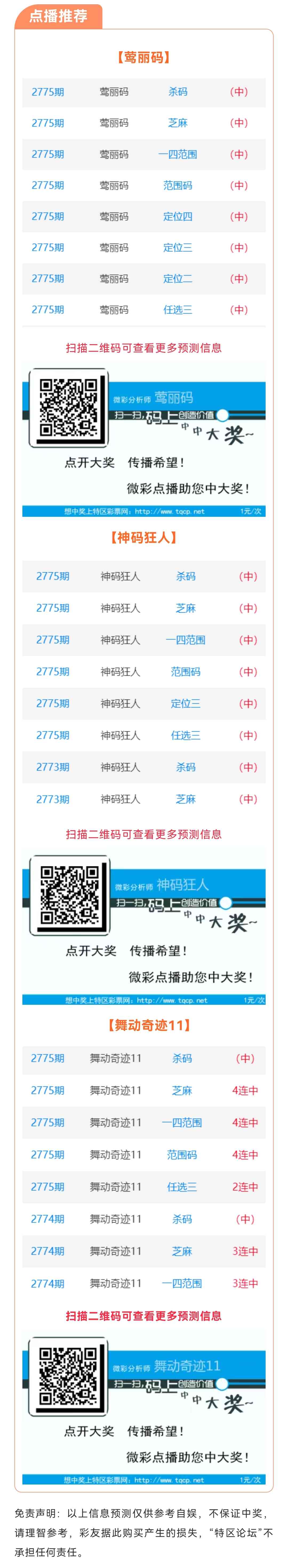 【点播推荐】2776期推荐“莺丽码”“神码狂人”“舞动奇迹11”3位分析师