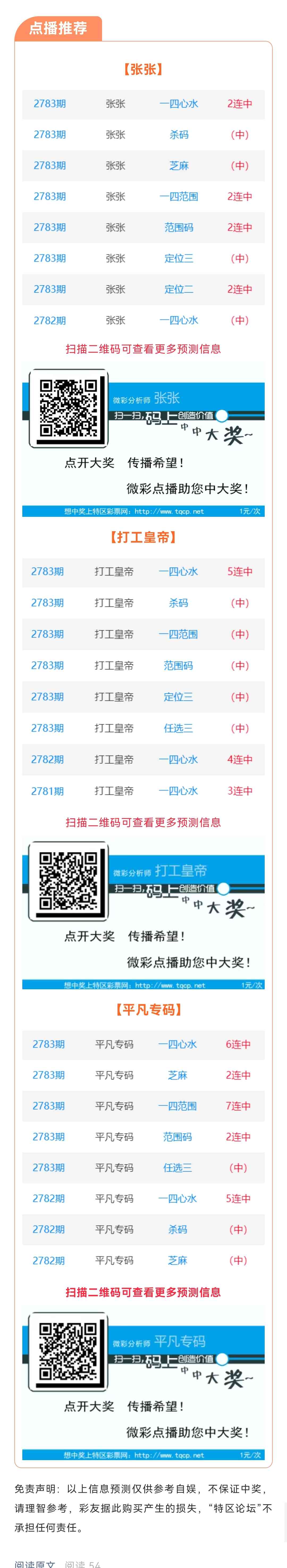 【点播推荐】2784期推荐“张张”“打工皇帝”“平凡专码”3位分析师