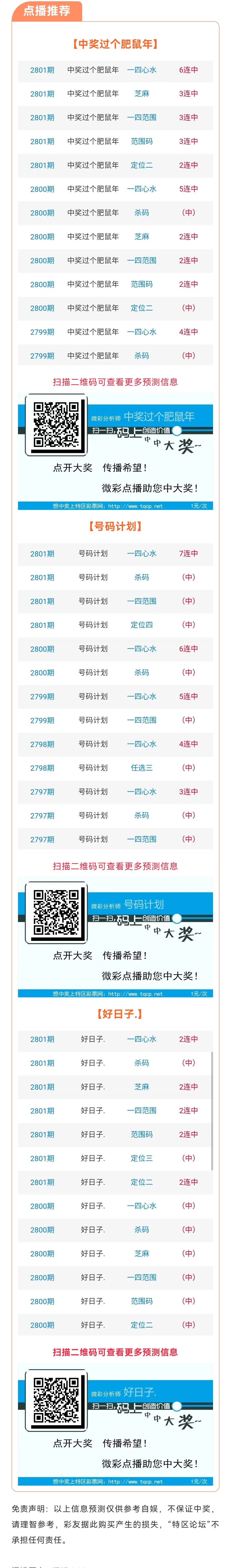【七星点播推荐】2802期推荐“中奖过个肥鼠年”“号码计划”“好日子”3位分析