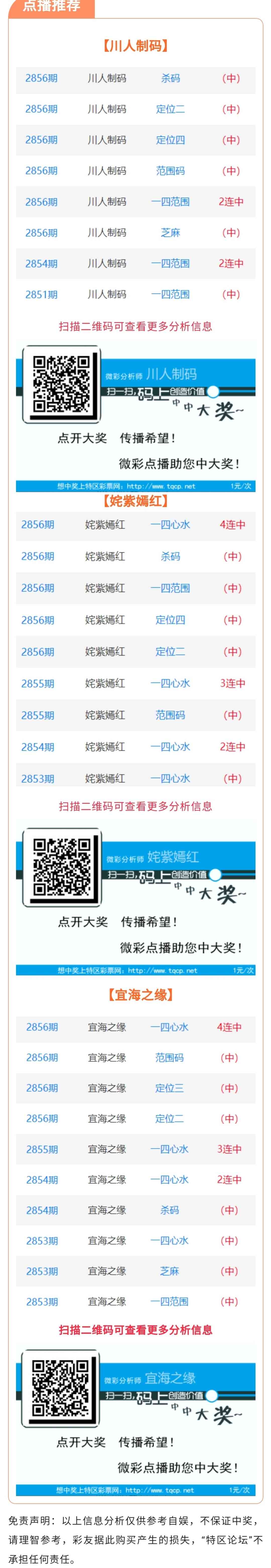 【七星点播推荐】2857期推荐“川人制码”“姹紫嫣红”“宜海之缘”3位分析