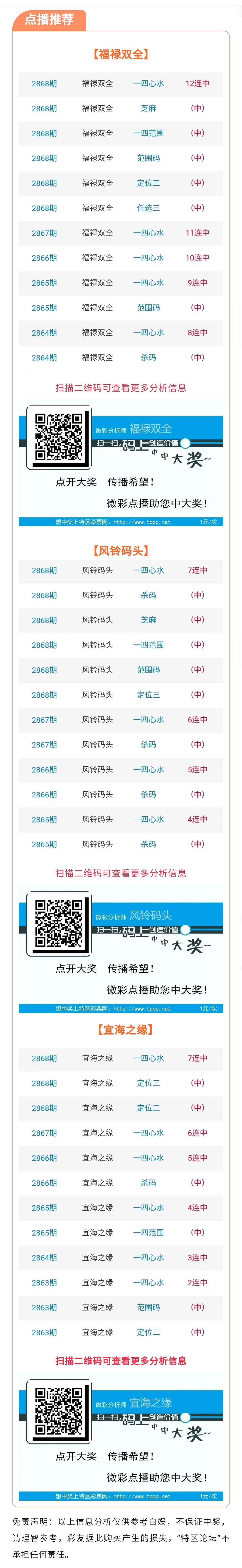 【七星点播推荐】2869期推荐“福禄双全”“风铃码头”“宜海之缘”3位分析