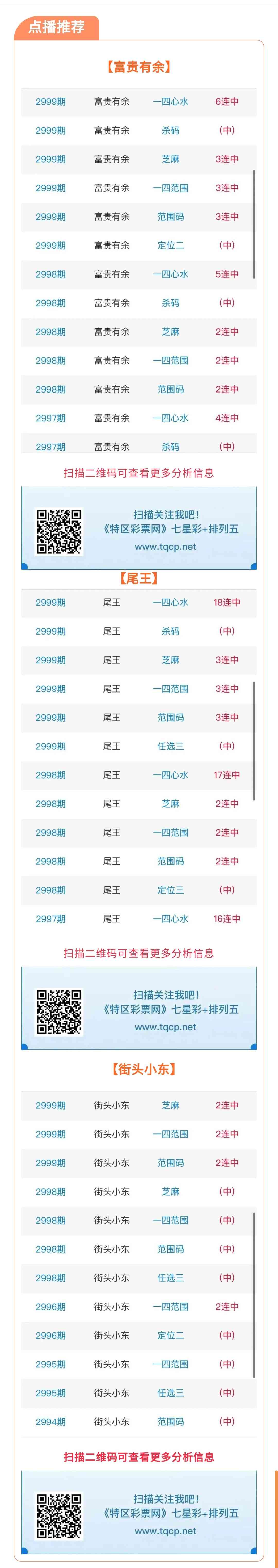 七星彩3000期点播推荐富贵有余、尾王和街头小东3位分析师