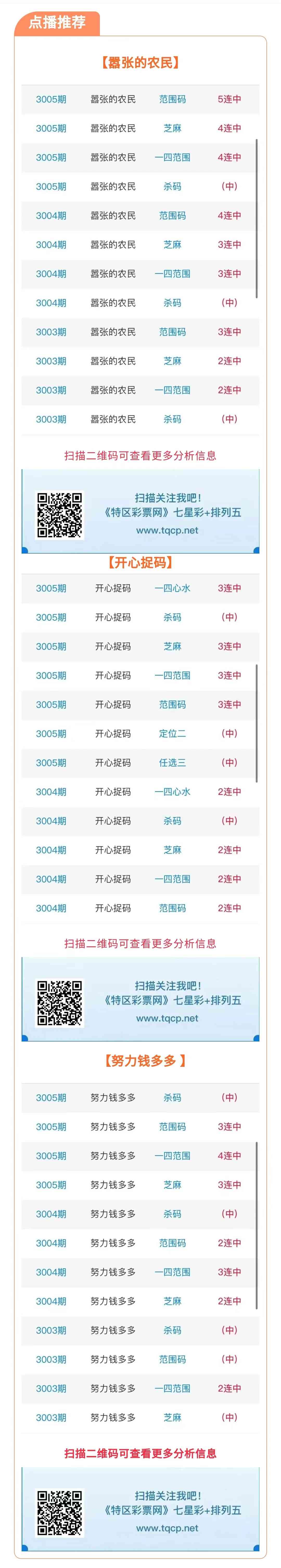 七星彩3006期点播推荐嚣张的农民、开心捉码和努力钱多多 3位分析师