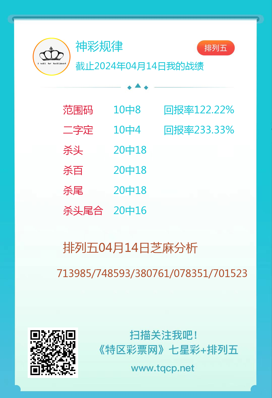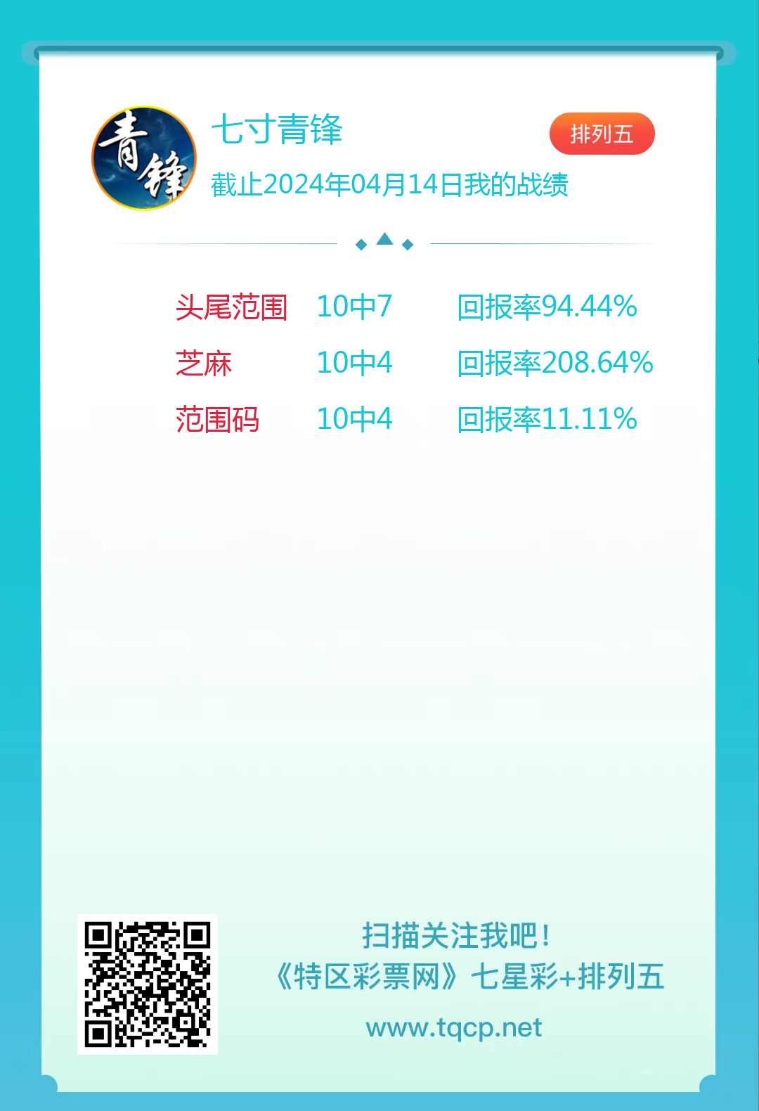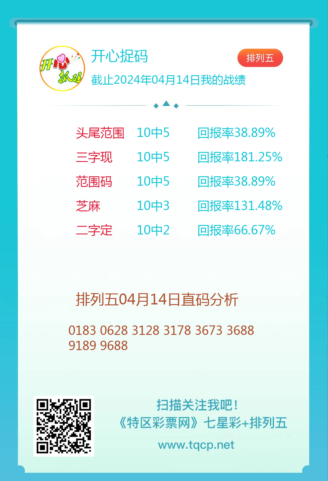 排列五24096期点播推荐开心捉码、神彩规律和七寸青锋 3位分析师