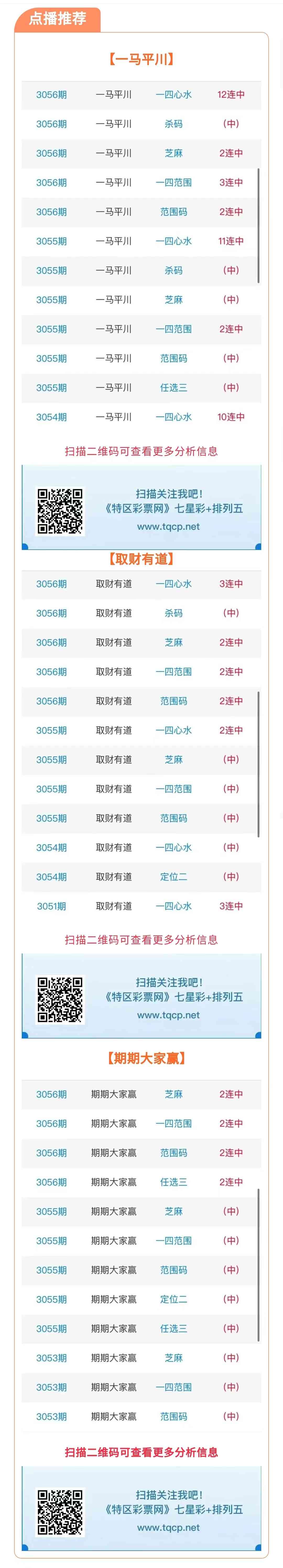 七星彩3057期点播推荐一马平川、取财有道和期期大家赢 3位分析师