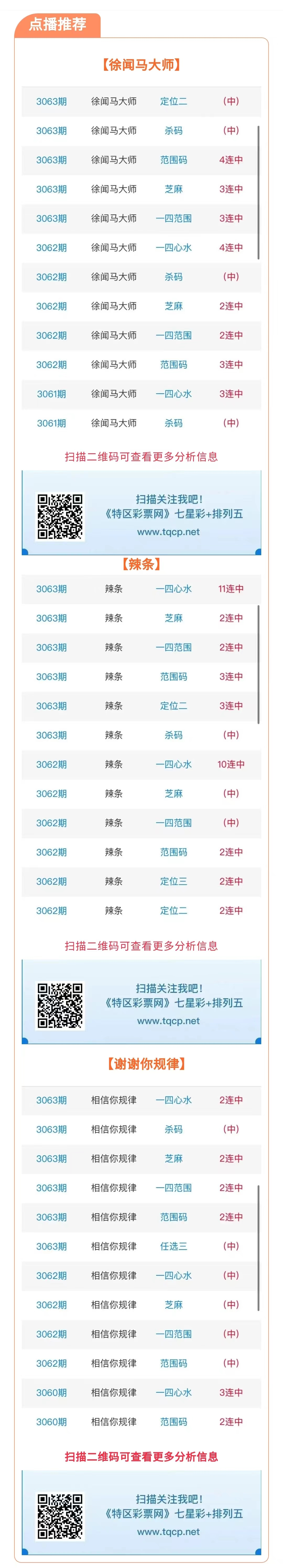 七星彩3064期点播推荐徐闻马大师、辣条和谢谢你规律 3位分析师
