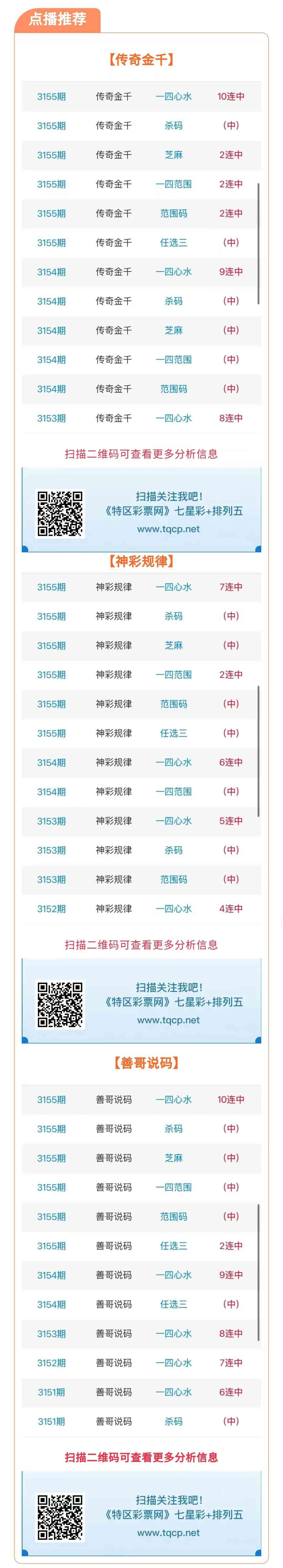 七星彩3156期点播推荐传奇金千、神彩规律和善哥说码 3位分析师