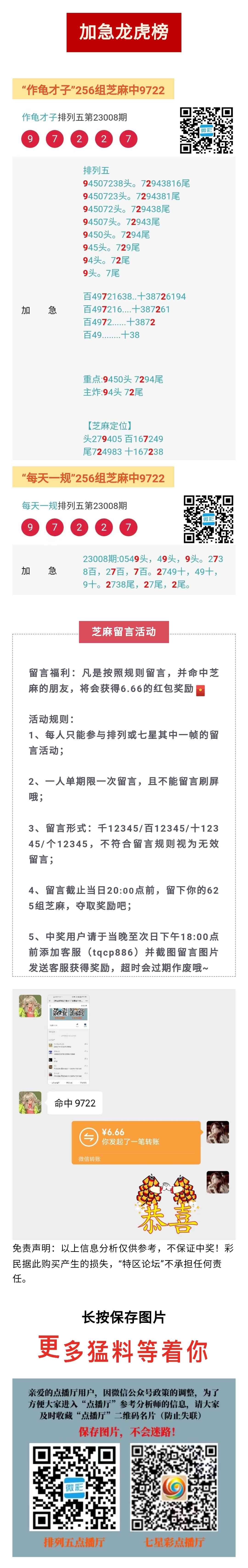 23009期:【特区排列五】留言区“Wedding...”大神256组中9722,喜获红包6.66元!