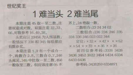 【世纪奖王】第1524期预测信息<特区报>