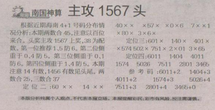 【南国神算】第1685期预测信息<特区报>