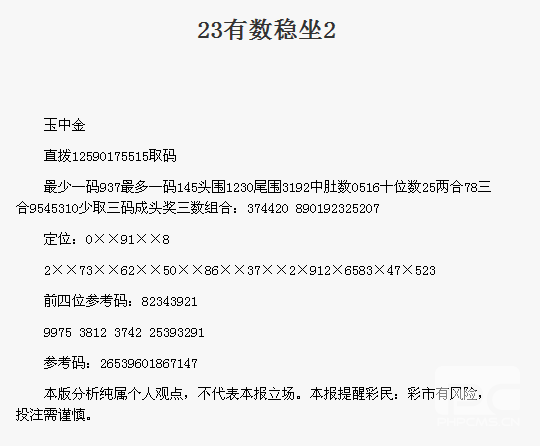 【玉中金】第1782期预测信息<特区报>