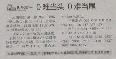 【世纪奖王】第1296预测信息<特区报>